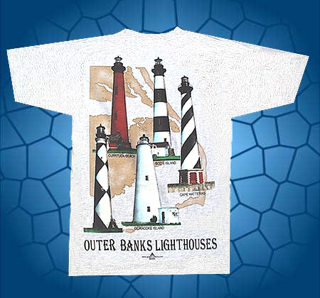 T-Shirt showcases the five lighthouses of the Outer Banks of North Carolina