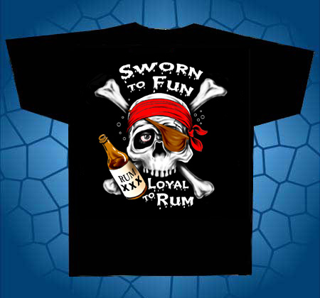 T-Shirt features a skull and cross bones with a bottle of rum. The design